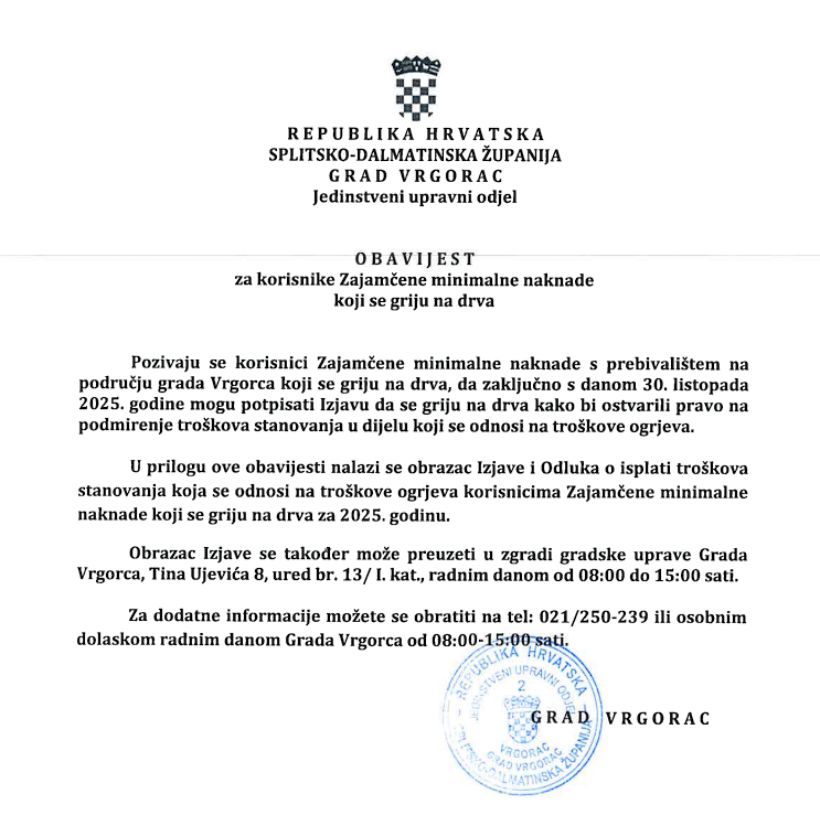 Grad Vrgorac pozvao je sve građane koji se griju na drva, a imaju prebivalište na području grada, da se prijave za bespovratna sredstva za podmirenje troškova stanovanja - točnije, za troškove ogrjeva.