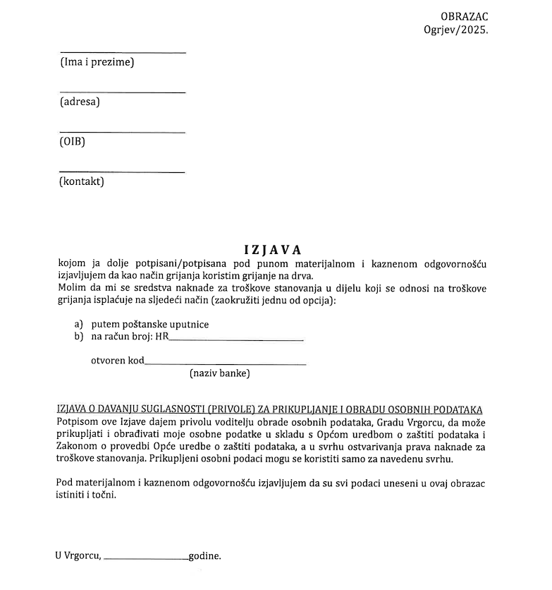 Korisnici trebaju potpisati obrazac kojim potvrđuju da se griju na drva, a isti se može preuzeti online te u zgradi Gradske uprave radnim danom od 08:00 do 15:00 sati.
