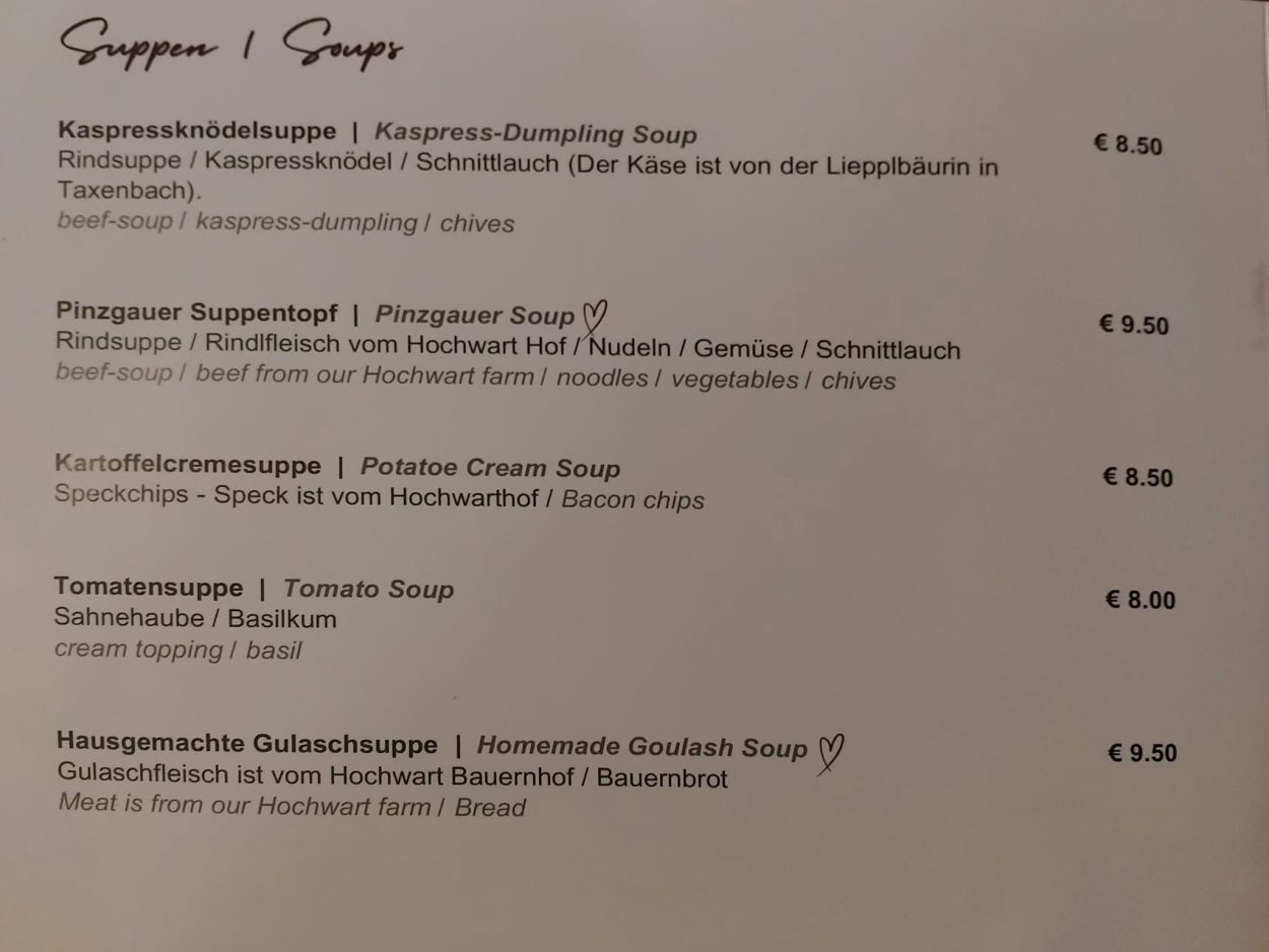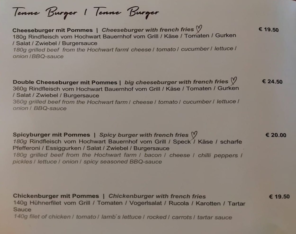 Osim kave i piva, visoke su i cijene jednostavnih jela. Burgeri s krumpirićima u običnim restoranima stoje od 19,50 do 24,50 eura, ovisno o veličini i vrsti mesa. Juhe se kreću od 8 do 9,50 eura, dok su jednostavna jela poput pomfrita 7,50 eura, a kobasice s kruhom od 9 do 10,50 eura. Desert poput štrudle od jabuka stoji od 6,50 do 7,50 eura, dok se tradicionalni germknödel plaća oko 10 eura.