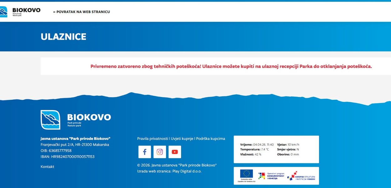 Iako se ulaznice inače kupuju putem web shopa https://shop.pp-biokovo.hr/ , internetska prodaja trenutačno je zatvorena zbog tehničkih poteškoća. Do otklanjanja problema, ulaznice se mogu kupiti na ulaznoj recepciji Parka prirode Biokovo.