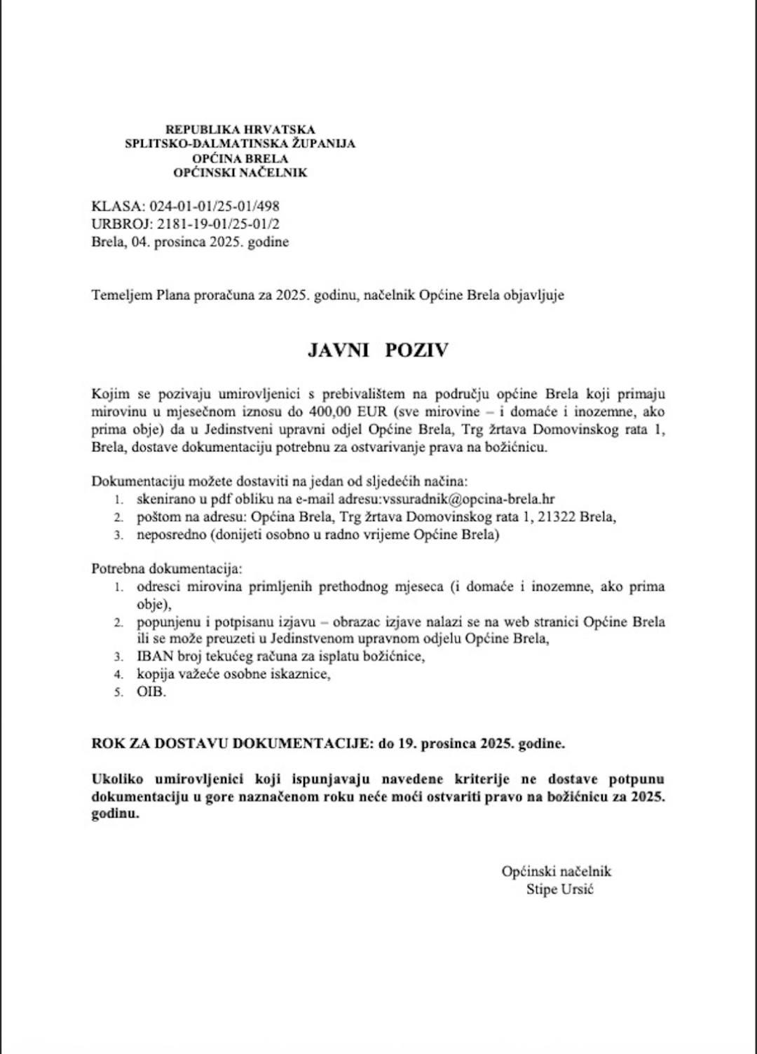 Umirovljenici koji ispunjavaju uvjete dužni su dostaviti propisanu dokumentaciju Jedinstvenom upravnom odjelu Općine Brela, na jedan od sljedećih načina: