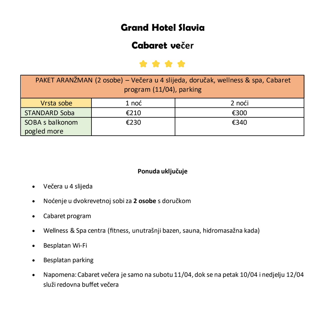 U ponudu smještaja uključeni su večera u četiri slijeda, noćenje u dvokrevetnoj sobi za dvije osobe s doručkom, cabaret program, korištenje wellness i spa centra, besplatan Wi Fi i parking. Iz hotela napominju kako je cabaret večer predviđena samo za subotu 11. travnja, dok se u petak 10. travnja i nedjelju 12. travnja poslužuje redovna buffet večera.