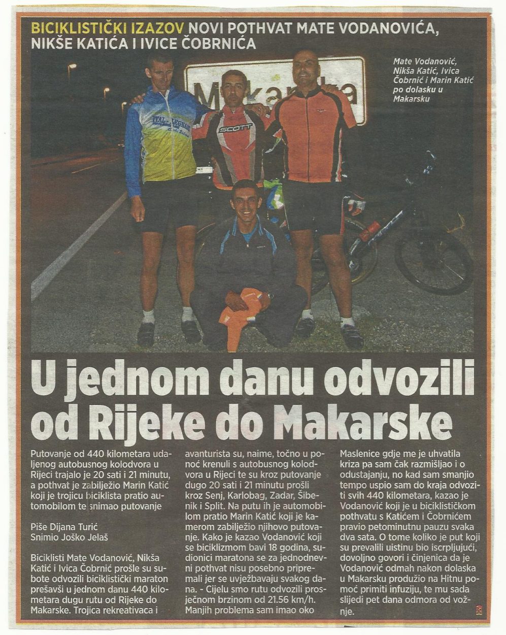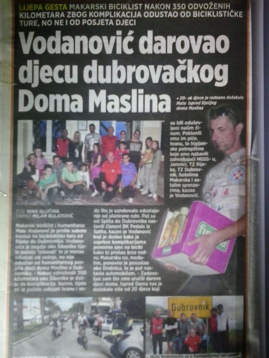 Ali ni to nam nije bilo dosta. Rekli smo: idemo još luđe. Rijeka - Makarska u jednom danu, oko 450 kilometara. Nas trojica smo to uspjeli, uz pratnju Marina Katića. Nakon toga vozili smo i Rijeka - Dubrovnik u trideset sati. U tim pothvatima pomagali su mi ljudi iz makarske stanice HGSS-a i mnogi drugi dobri ljudi. U Dubrovnik smo donijeli i humanitarnu donaciju za dom Maslina. Ja osobno nisam izdržao cijelu dionicu, prije Šibenika su me uhvatili grčevi, ali cilj smo ispunili. Djeca su dobila ono zbog čega smo krenuli.