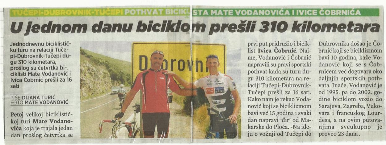 Sljedeća ideja bila je Zagreb - Makarska u jednom danu. Ivica je prije puta ozlijedio nogu pa smo na kraju turu odradili Nikša Katić i ja, dok nas je Ivica pratio autom. Spremali smo se mjesecima i uspjeli za 20 sati. Kad smo stigli, završili smo ravno na hitnoj, na infuziji. Tijelo je bilo potpuno iscrpljeno, na granici izdržljivosti. Još danima nakon toga u snu bih se budio i vidio kako mi se noge same okreću, kao da i dalje pedaliram.