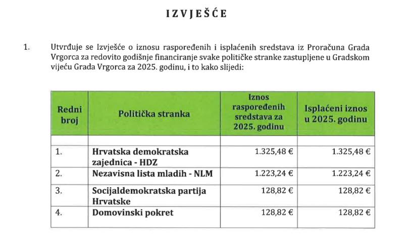 Prema objavljenim podacima, Hrvatska demokratska zajednica dobila je 1.325,48 eura, Nezavisna lista mladih 1.223,24 eura, dok su Socijaldemokratska partija Hrvatske i Domovinski pokret primili po 128,82 eura. U izvješću se navodi da su sredstva raspoređena i isplaćena u navedenim iznosima tijekom 2025. godine.