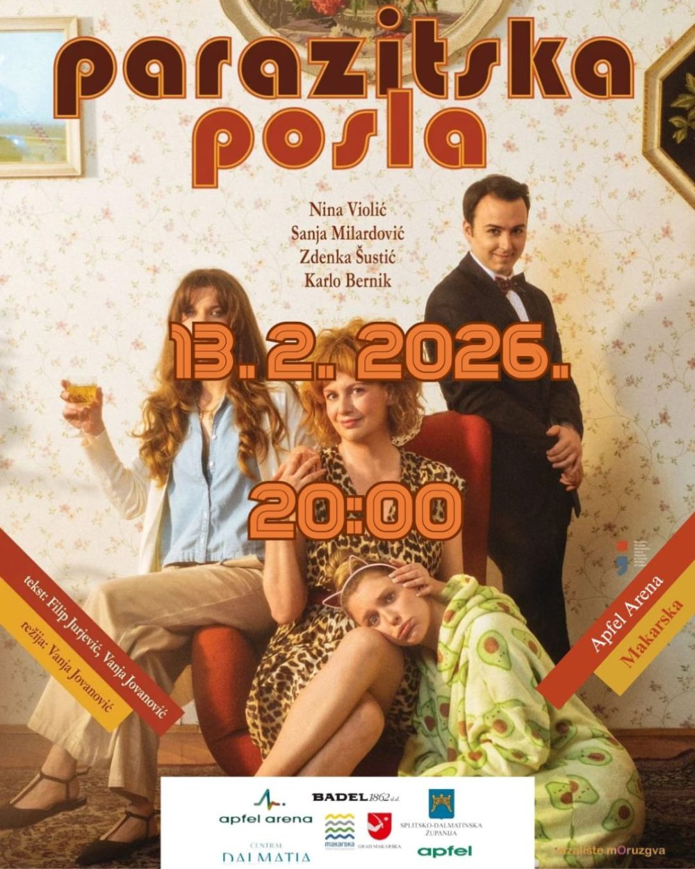 Kazalište Moruzgva u Makarsku donosi novu predstavu „Parazitska posla“, koja će biti izvedena u petak, 13. veljače 2026. godine u Apfel Areni, s početkom u 20 sati.