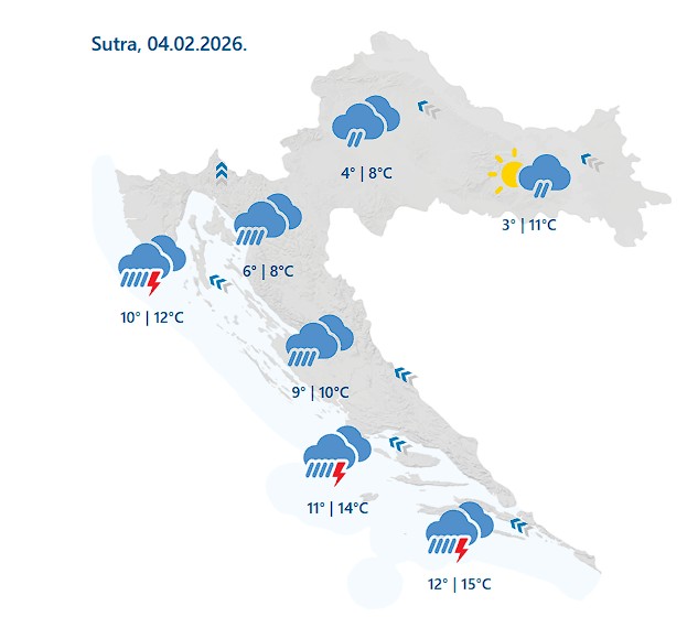 Na Jadranu i u priobalju očekuju se lokalno izraženiji pljuskovi praćeni grmljavinom te obilna oborina. U Dalmaciji će jugo sutra biti umjereno do jako, ponegdje i olujno.