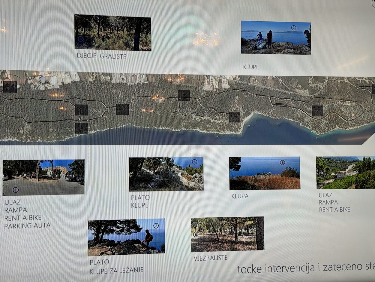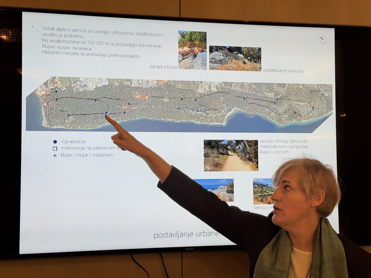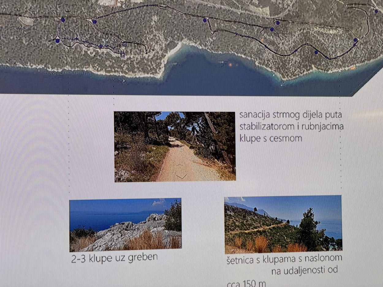 Popravlja se šetnica koja je djelomično urušena. Uz stazu će biti uređena odmorišta, dječje igralište i teretana na otvorenom. Ne ruše se nikakva stabla, a projekt je prilagođen postojećem terenu. Planirana su četiri odmorišta s klupama koje imaju pogled na more, izrađena od prirodnih materijala. Rasvjeta je isključivo solarna. Postavljaju se stupovi i manja rasvjetna tijela u podu, a bit će osvijetljena trećina šetnice, oko kilometar i pol, rekla je Branka Juras, projektantica.