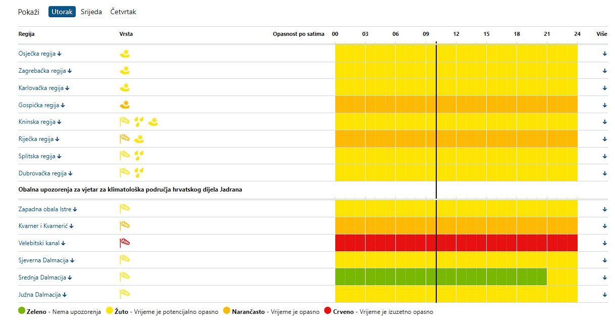 Prema kraju dana očekuje se postupno smirivanje vremena i razvedravanje sa zapada. Četvrtak bi, nakon noćnog snijega na kopnu i kiše na jugu, trebao biti uglavnom suh i sunčan. Jutro će pritom biti vrlo hladno, a temperature u unutrašnjosti mogle bi se spustiti i do minus deset stupnjeva.