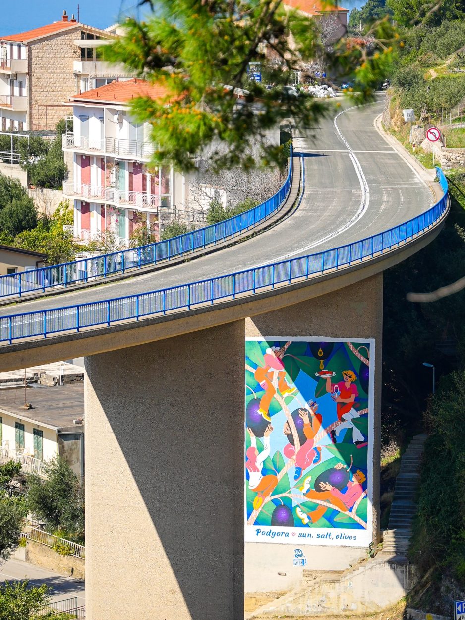 U Podgori je osvanuo novi mural koji donosi boju i mediteranski ugođaj na javni prostor. Na stupu vijadukta Jadranske magistrale oslikan je mural Adriatic Phlegmatic, umjetnička oda maslini, soli, moru i dalmatinskom načinu života.