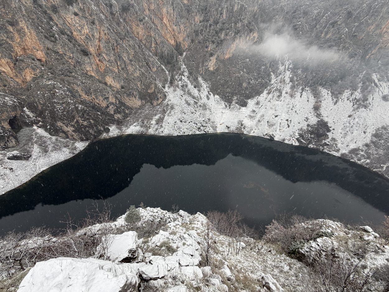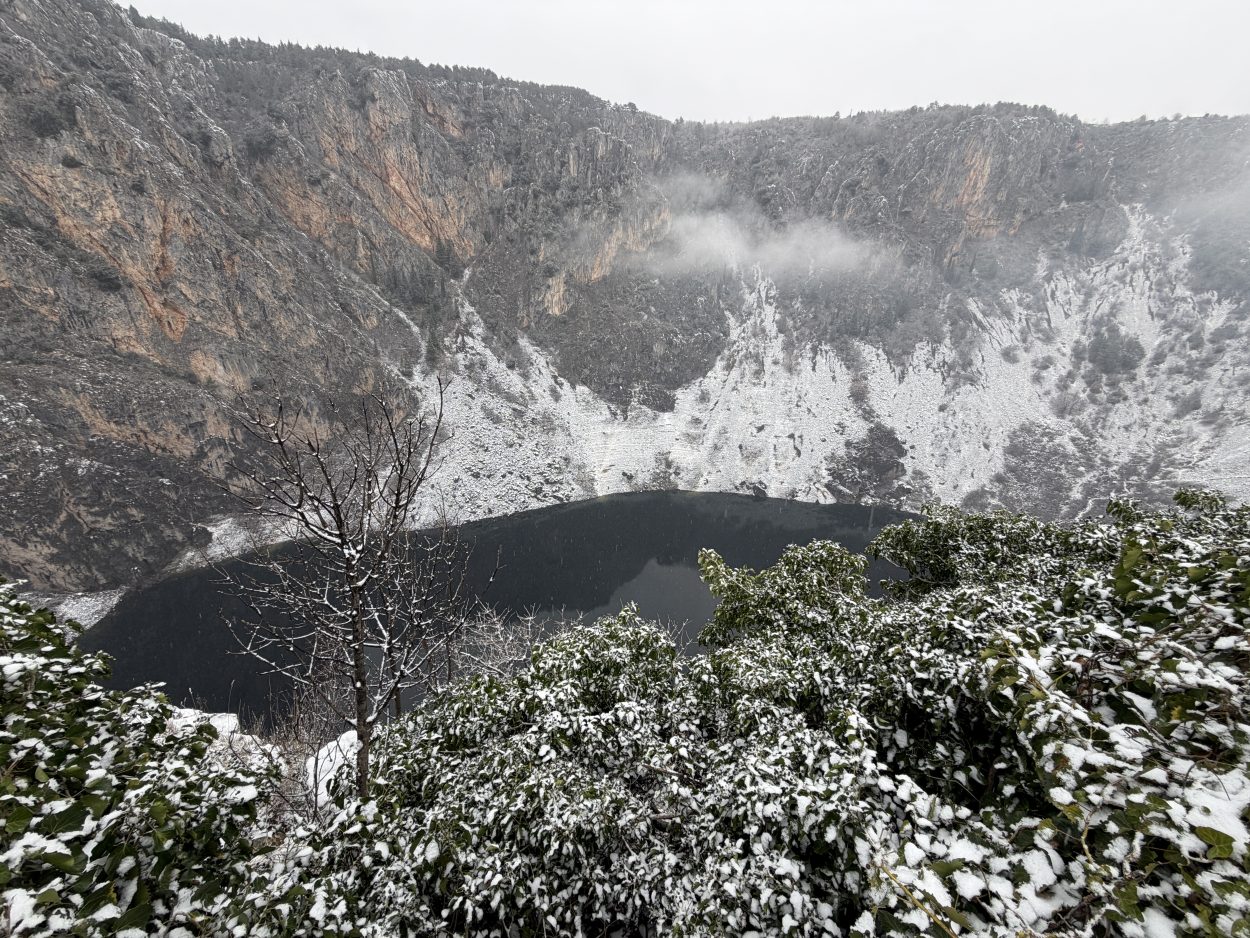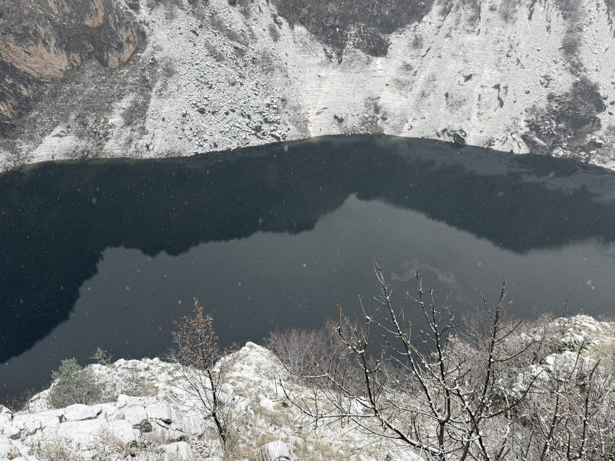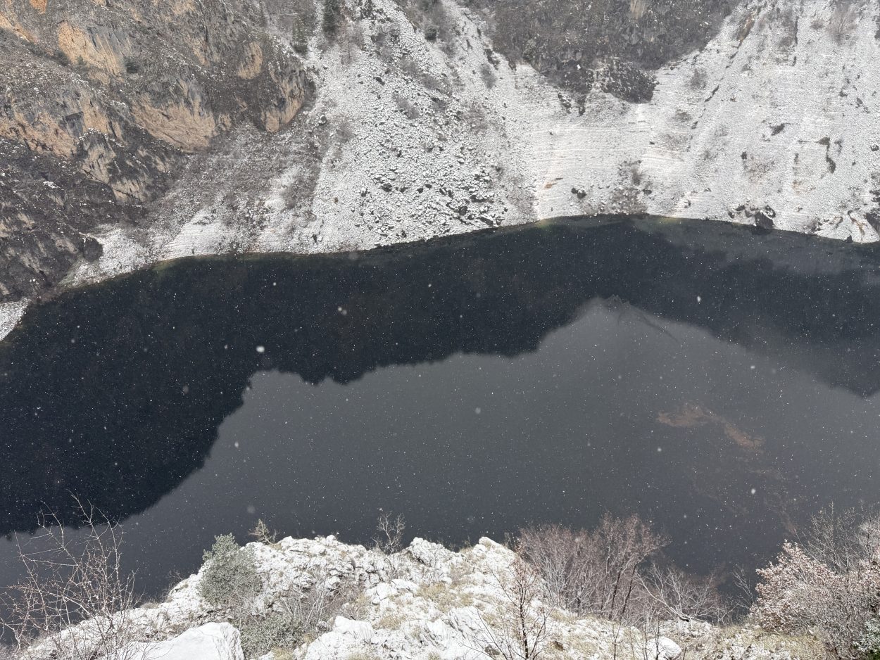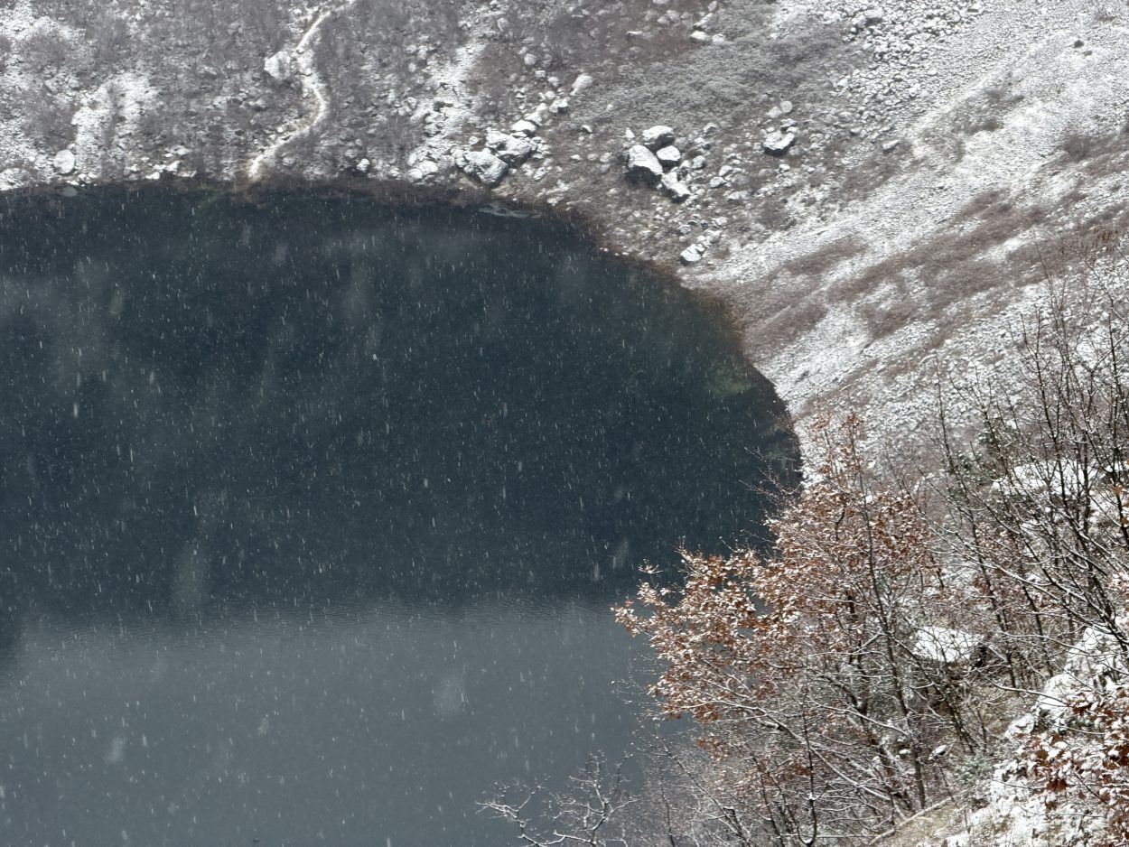 Prije mjesec i pol Modro jezero bilo je potpuno suho, s vidljivim kamenitim dnom. Obilne kiše koje su posljednjih dana pale na ovom području ubrzano su punile jezero, koje je danas, napunjeno vodom, dočekalo i prvi ovogodišnji snijeg.