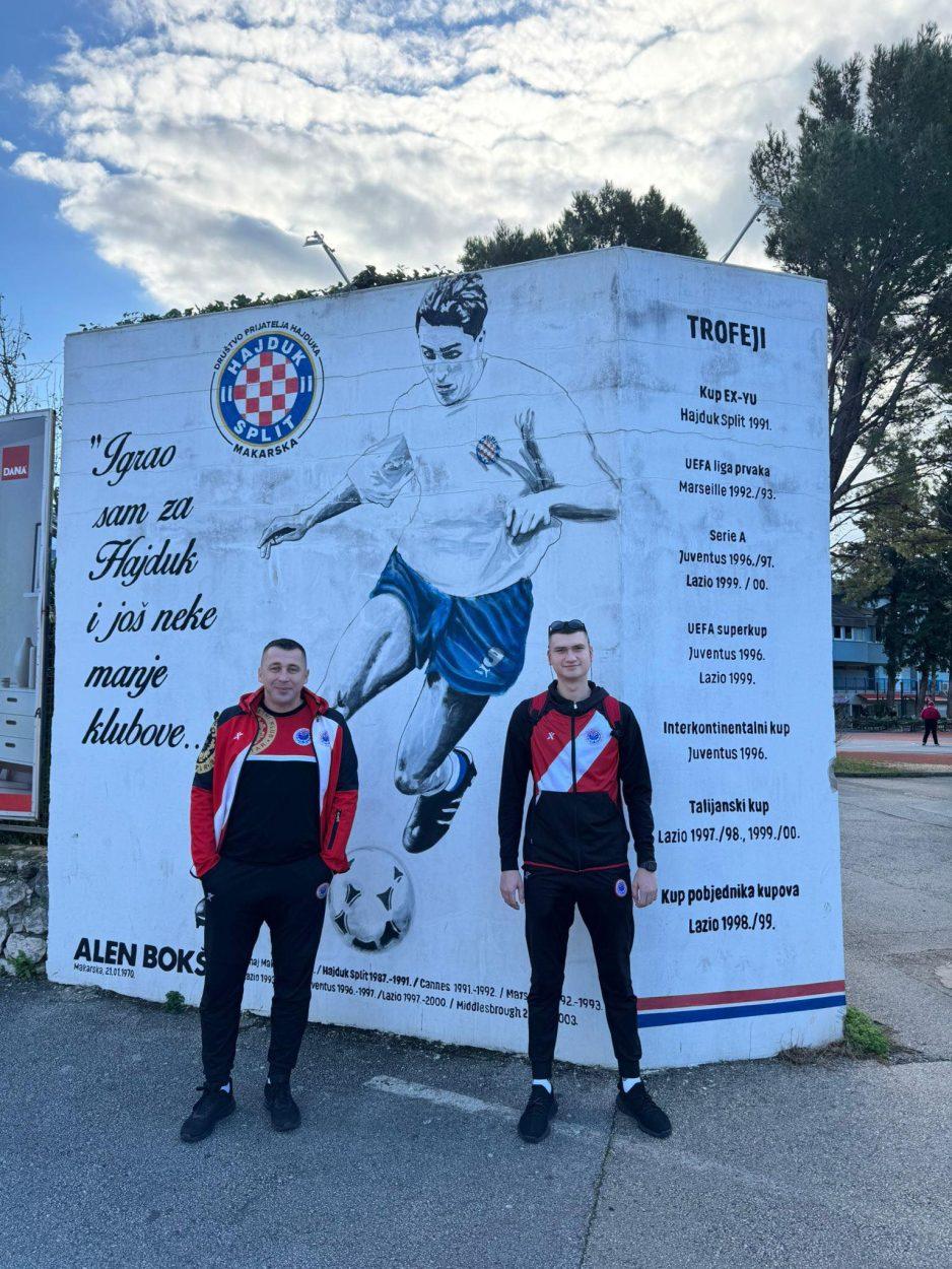 Trener vratara Mario Maći Sesar i krilni rukometaš Zrinjskog Josip Komadina fotografirali su se i ispred murala proslavljenog hrvatskog nogometaša Alena Bokšića, koji je postao nezaobilazna točka za sportaše koji borave u Makarskoj.