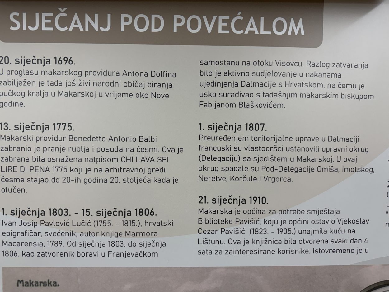 Izložba pokazuje kako je siječanj, iako često doživljen kao miran i zimski mjesec, kroz povijest bio iznimno važan za grad. Brojni politički, društveni, kulturni i svakodnevni događaji koji su ostavili trag u kolektivnoj memoriji Makarske zbili su se upravo tada.