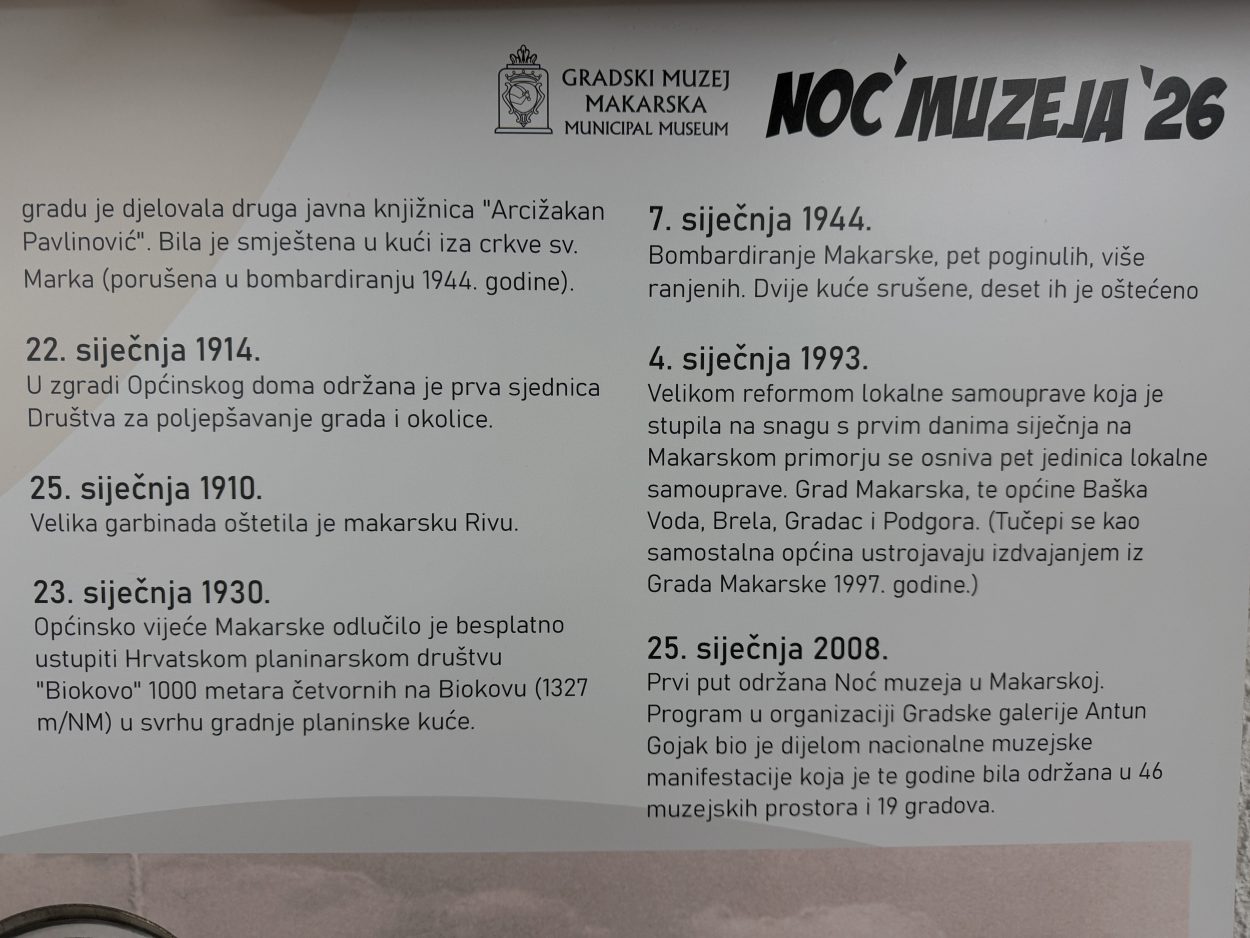 U sklopu ovogodišnje Noći muzeja, u Gradskom muzeju Makarska otvorena je izložba Siječanj za sjećanje, koja kroz stare fotografije i povijesne zapise donosi pregled značajnih događaja iz makarske prošlosti, a zajedničko im je to što su se dogodili upravo u prvom mjesecu godine.