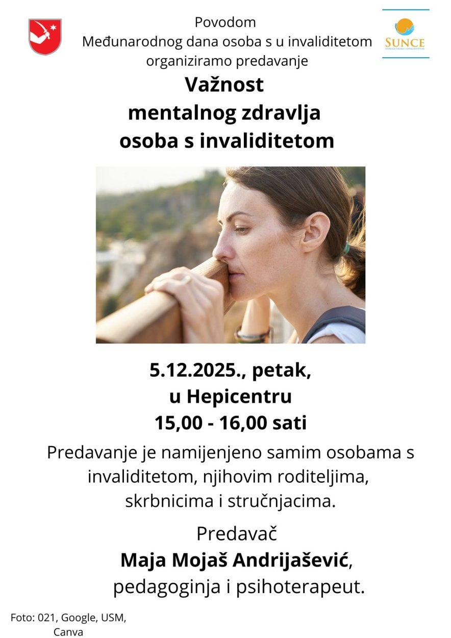 Drugi dio programa održava se istoga dana od 15 do 16 sati u Hepicentru, gdje će pedagoginja i psihoterapeut Maja Mojaš Andrijašević održati predavanje na temu važnosti mentalnog zdravlja osoba s invaliditetom. Predavanje je namijenjeno osobama s invaliditetom, njihovim roditeljima, skrbnicima i stručnjacima koji s njima rade.