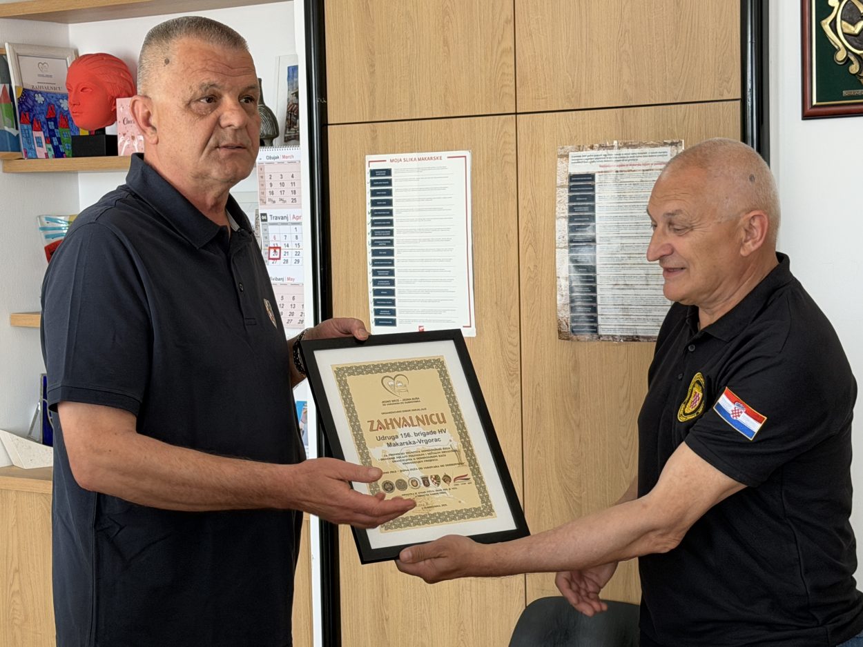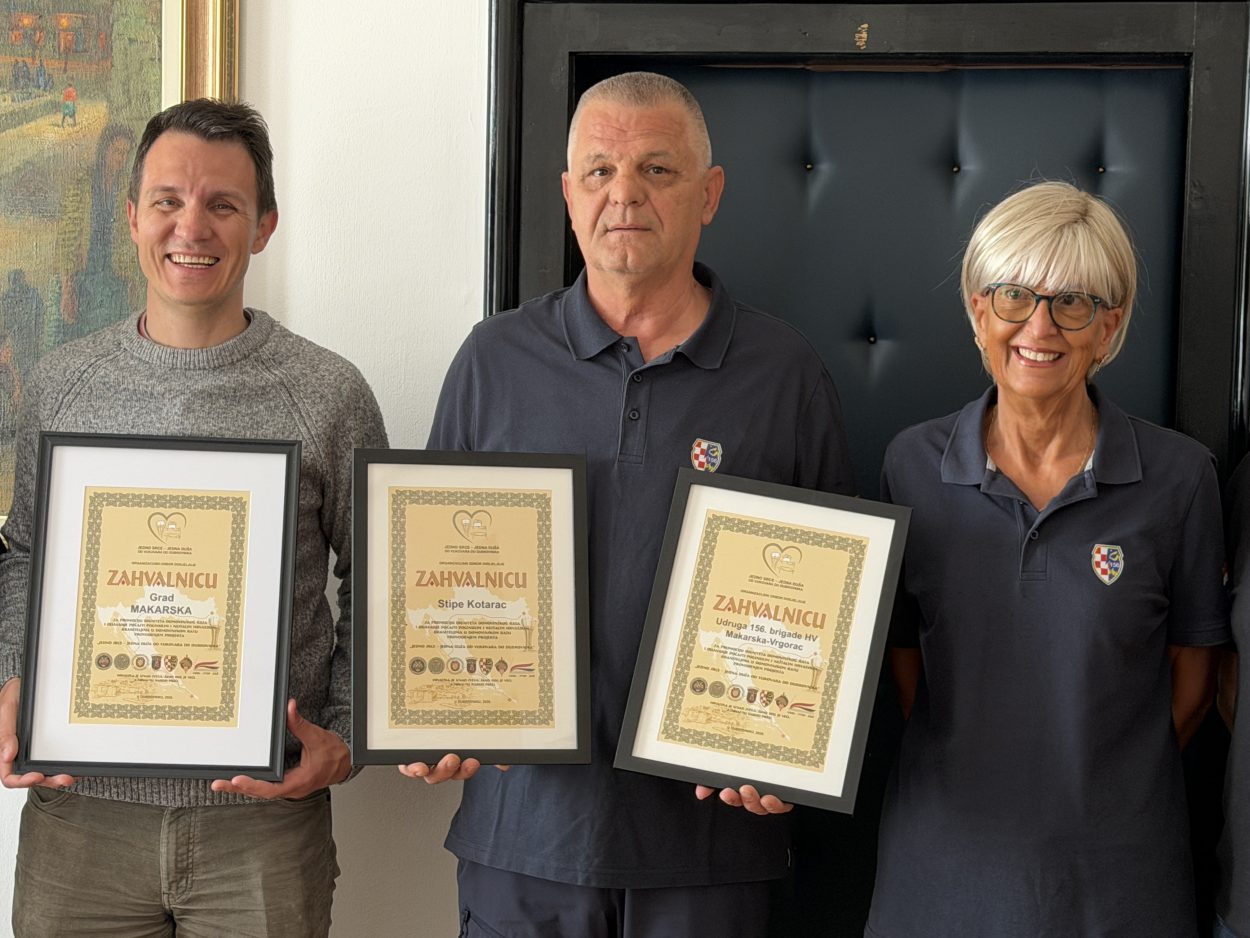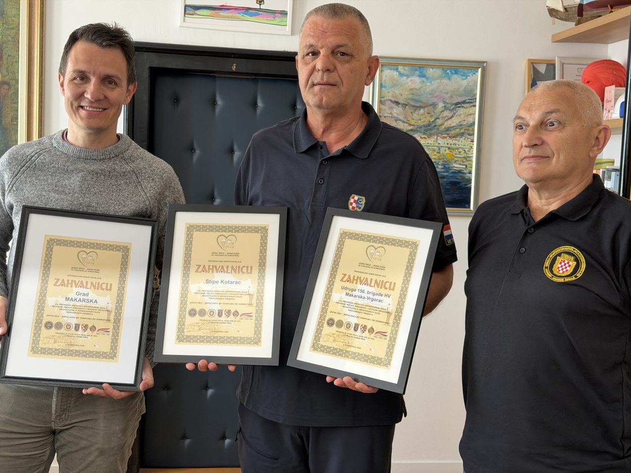 Predstavnici projekta Jedno srce - jedna duša od Vukovara do Dubrovnika danas su u makarskom Gradskom poglavarstvu uručili zahvalnice gradonačelniku Zoranu Paunoviću, Stipi Kotarcu te Udruzi 156. brigade HV Makarska Vrgorac.
